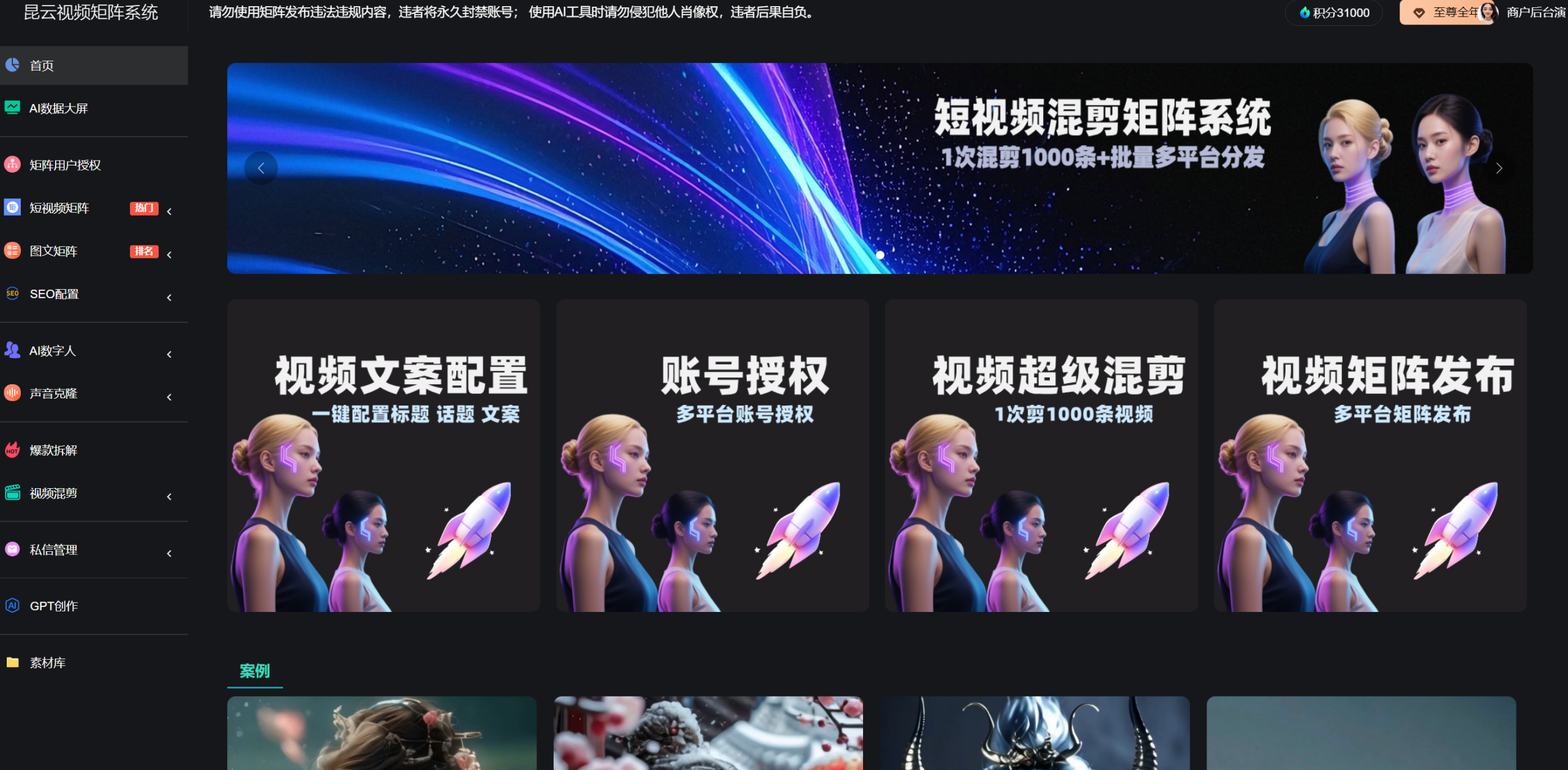 昆云矩阵系统是集视频批量混剪与多平台账号矩阵管理于一体的 SaaS 平台,支持一键批量混剪、爆款拆解、矩阵定时分发、图文视频同步推送、数据看板、AI 数字人克隆与合成、AI 标题文案生成、企业私信管理。可显著提升短视频产能,一人即可高效运营,适配电商、MCN、企业营销等场景,提供完善操作文档与高性价比服务方案。